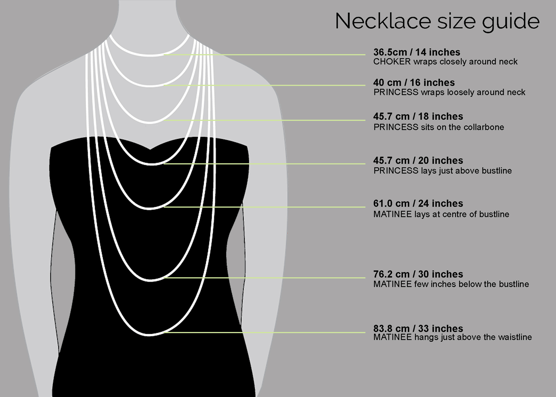 The perfect necklace length is very individual, but there are a few ways to figure out which length will suit you best. Read the chart below to find your new favourite necklace length.