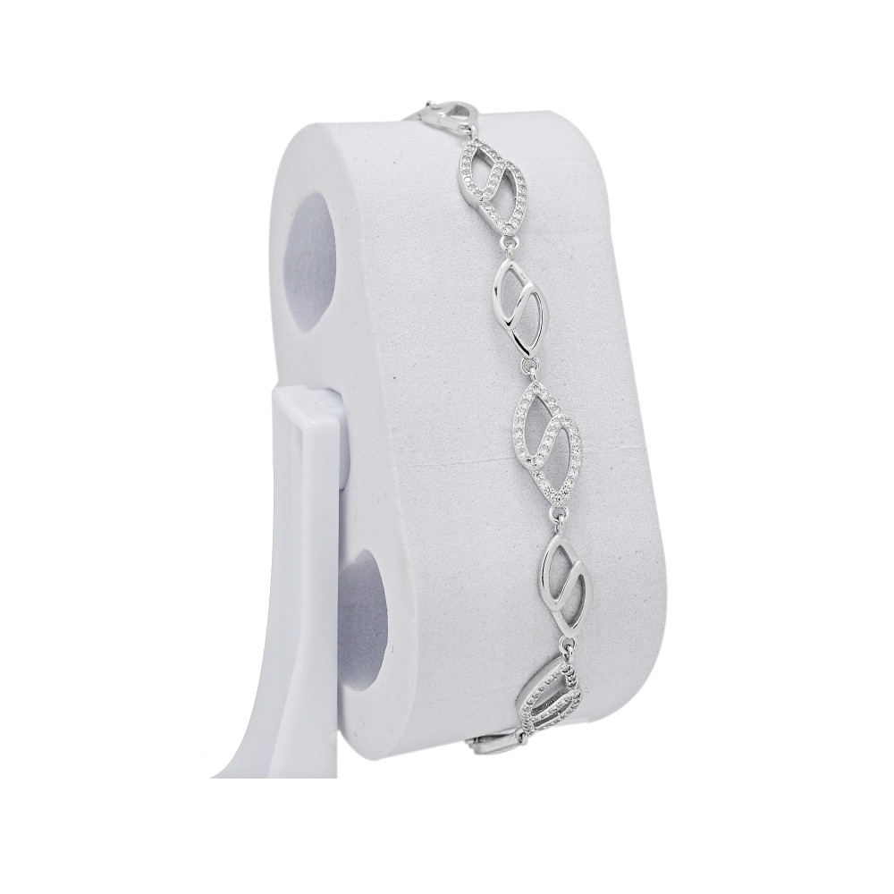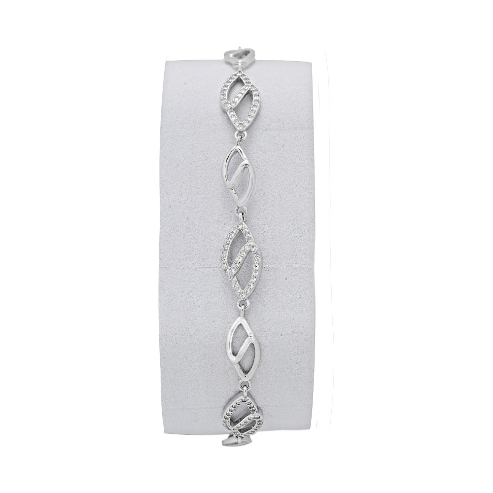 Surrounding the bracelet are sparkling zircon stones, meticulously placed to create a mesmerizing display of brilliance and elegance. Each stone captures and reflects light with enchanting radiance, adding a touch of glamour to your every movement. The combination of the rhodium plating and zircon stones creates a harmonious blend of sophistication and luxury.